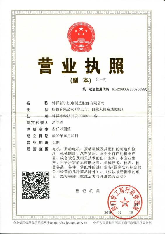 鐘祥新宇機(jī)電制造股份有限公司前身是鐘祥電機(jī)廠,1968年 籌建工廠,原機(jī)電部確認(rèn)為定點(diǎn)生產(chǎn)中小型電機(jī)的專業(yè)廠家。于2014年09月24日由“鐘祥新宇機(jī)電制造有限公司”變更名為“鐘祥新宇機(jī)電制造股份有限公司”。主要生產(chǎn)各類振動(dòng)電機(jī)、振動(dòng)機(jī)械、輸送機(jī)械。是中國電器工業(yè)協(xié)會(huì)中小型電機(jī)分會(huì)理事單位、中國重型機(jī)械工業(yè)協(xié)會(huì)洗選設(shè)備專業(yè)委員會(huì)理事單位,是中國大型的振動(dòng)電機(jī)生產(chǎn)廠家。
