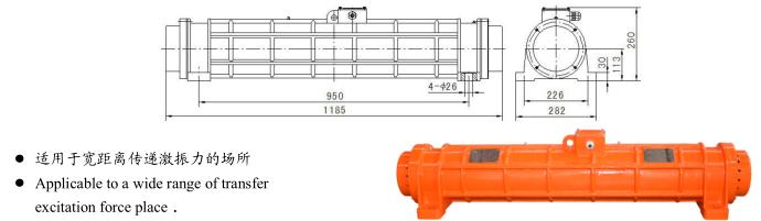 3、由于機座為長形的圓柱體結(jié)構(gòu)(類似細長桿結(jié)構(gòu)),產(chǎn)生的激振力作用點距離(地腳孔的距離)較寬,對于要求在寬距離傳遞激振力的場所尤其適用。